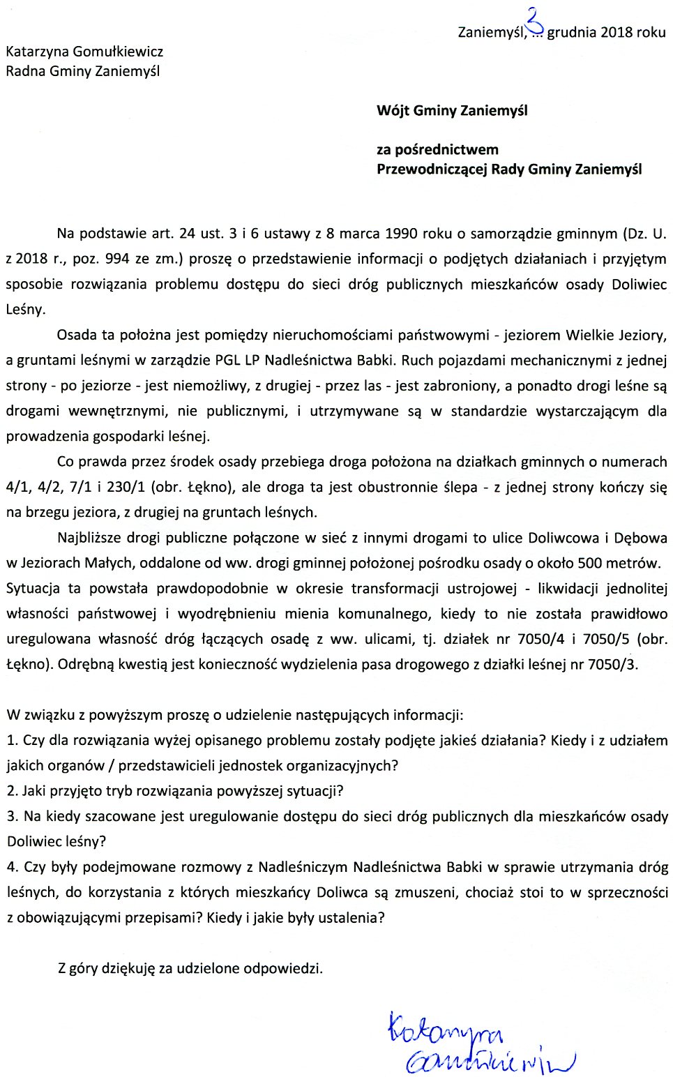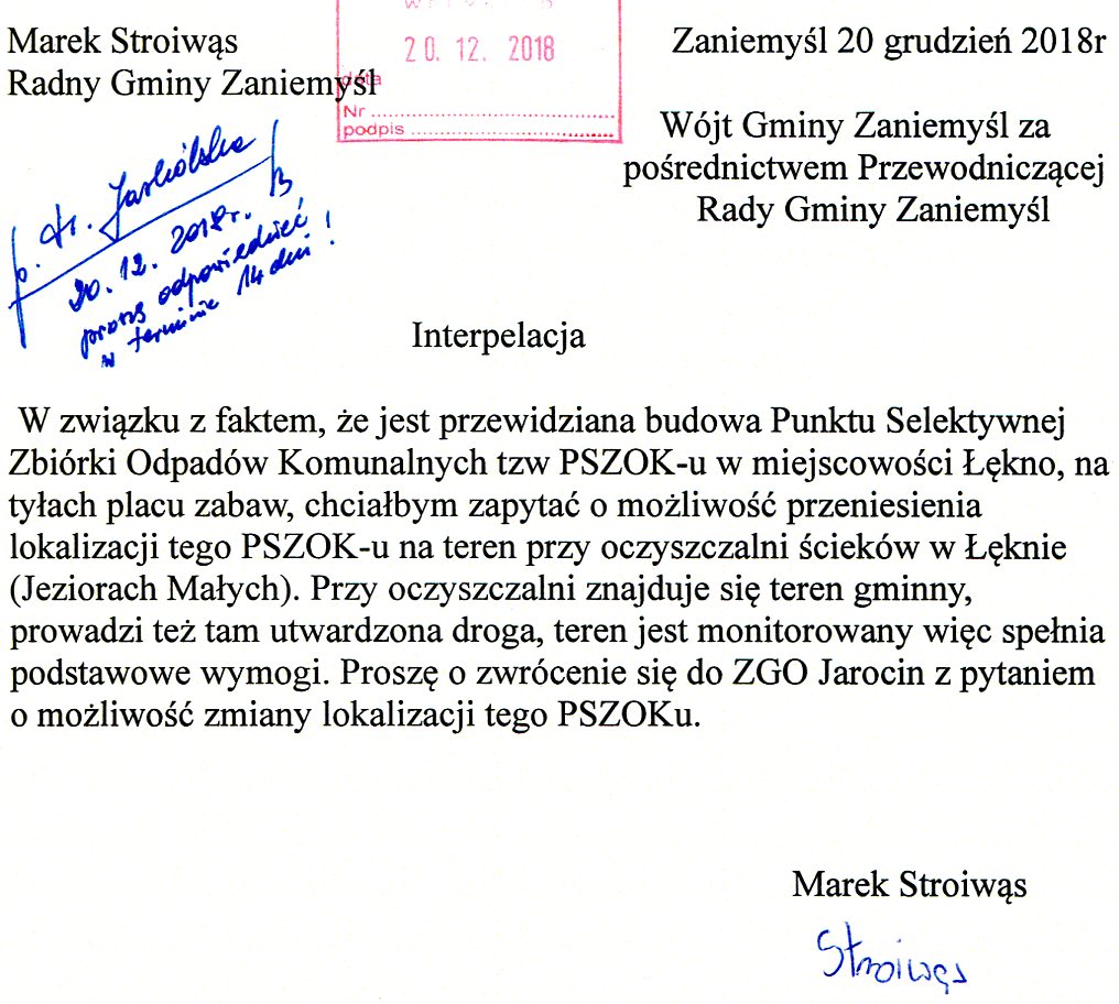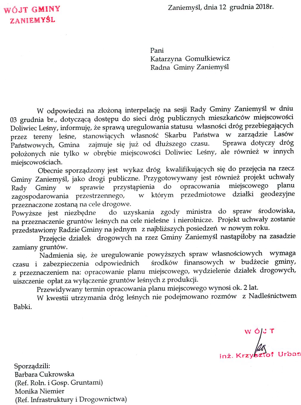 odpowiedź ustna Wójta na II sesji Rady Gminy Zaniemyśl dnia 3.12.2018r. zawarta w protokole z sesji Nr OR.RG.0002.2.2018-2023