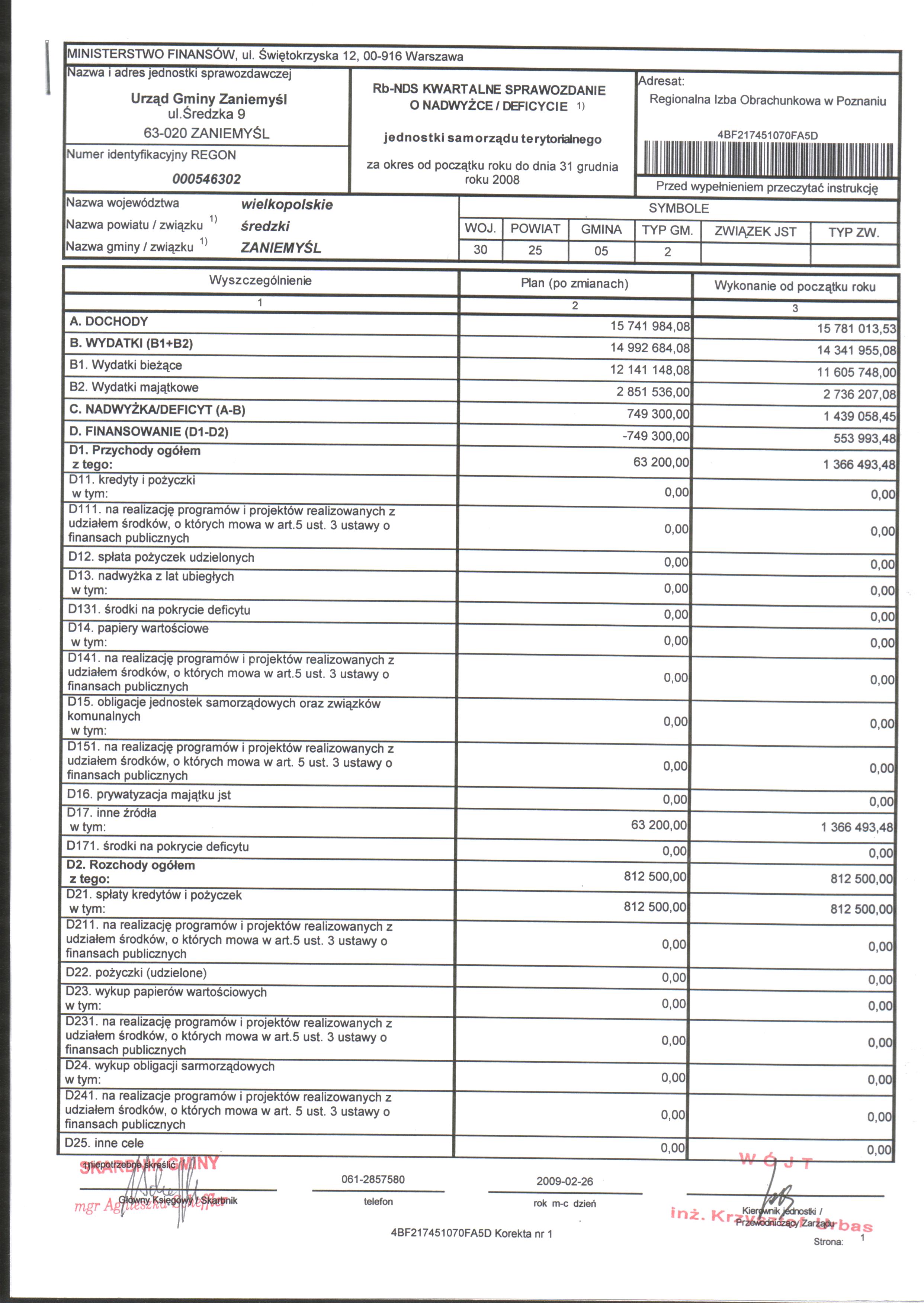 Kwartalne sprawozdanie o nadwyżce/deficycie jednostki samorzadu terytorialnego za okres od początku roku do 31 grudnia 2008 ( Rb-NDS) - pobierz