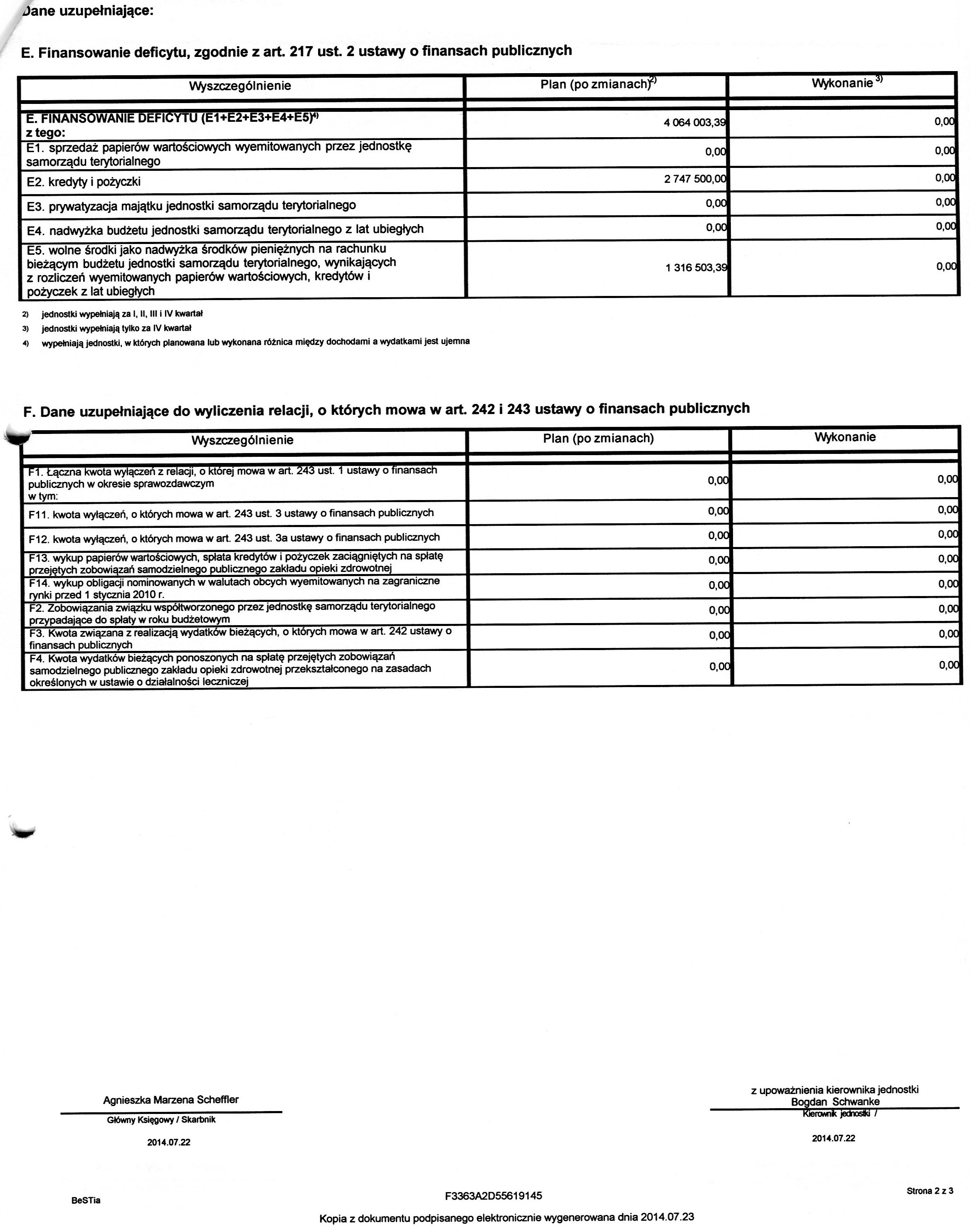 Rb - NDS Kwartalne sprawozdanie o nadwyżce/deficycie jednostki samorządu terytorialnego za okres od początku roku do dnia 30 czerwca 2014 roku - strona 1, strona 2