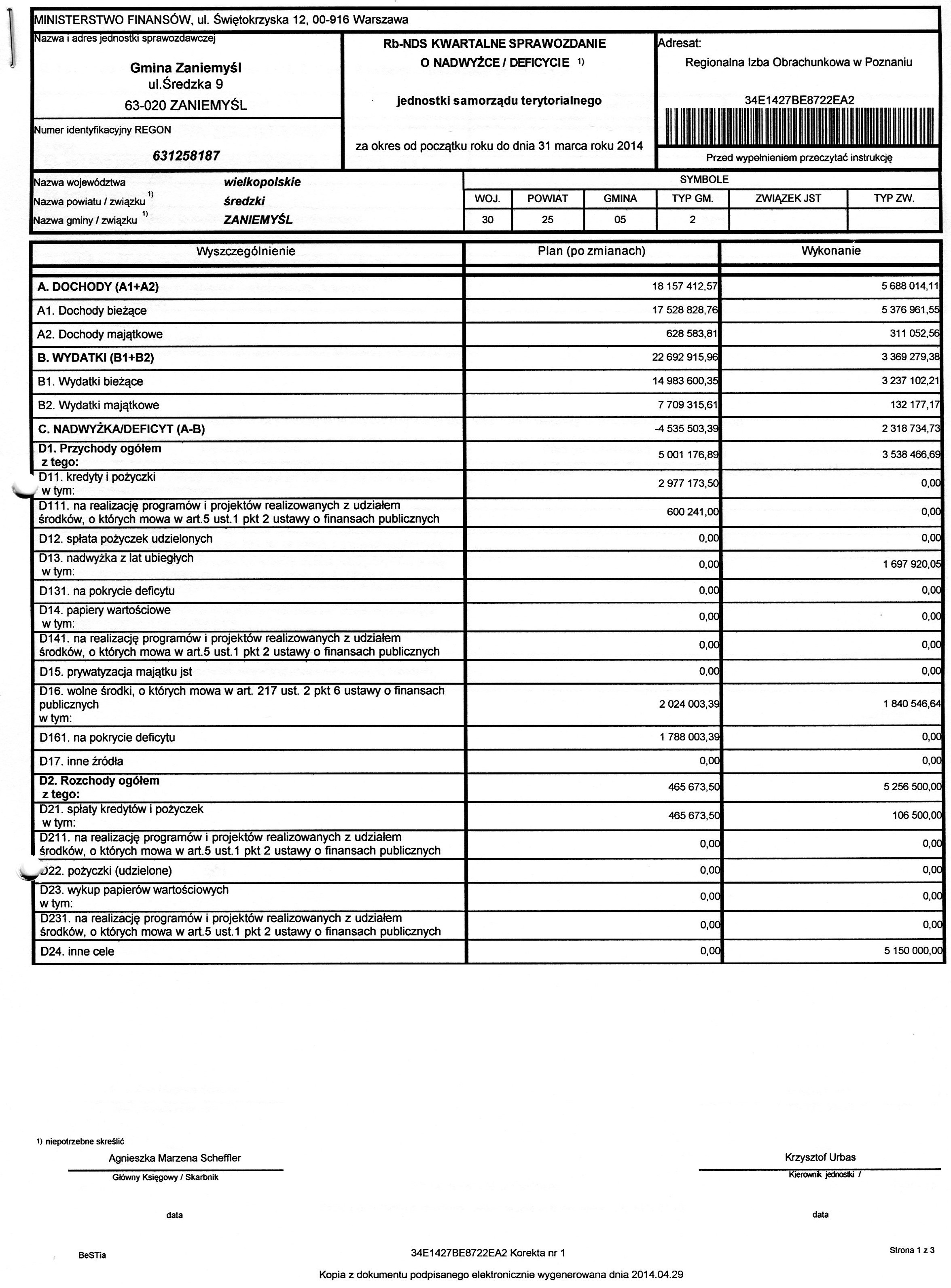 Rb - NDS Kwartalne sprawozdanie o nadwyżce/deficycie jednostki samorządu terytorialnego za okres od początku roku do dnia 31 marca 2014 roku - strona 1, strona 2