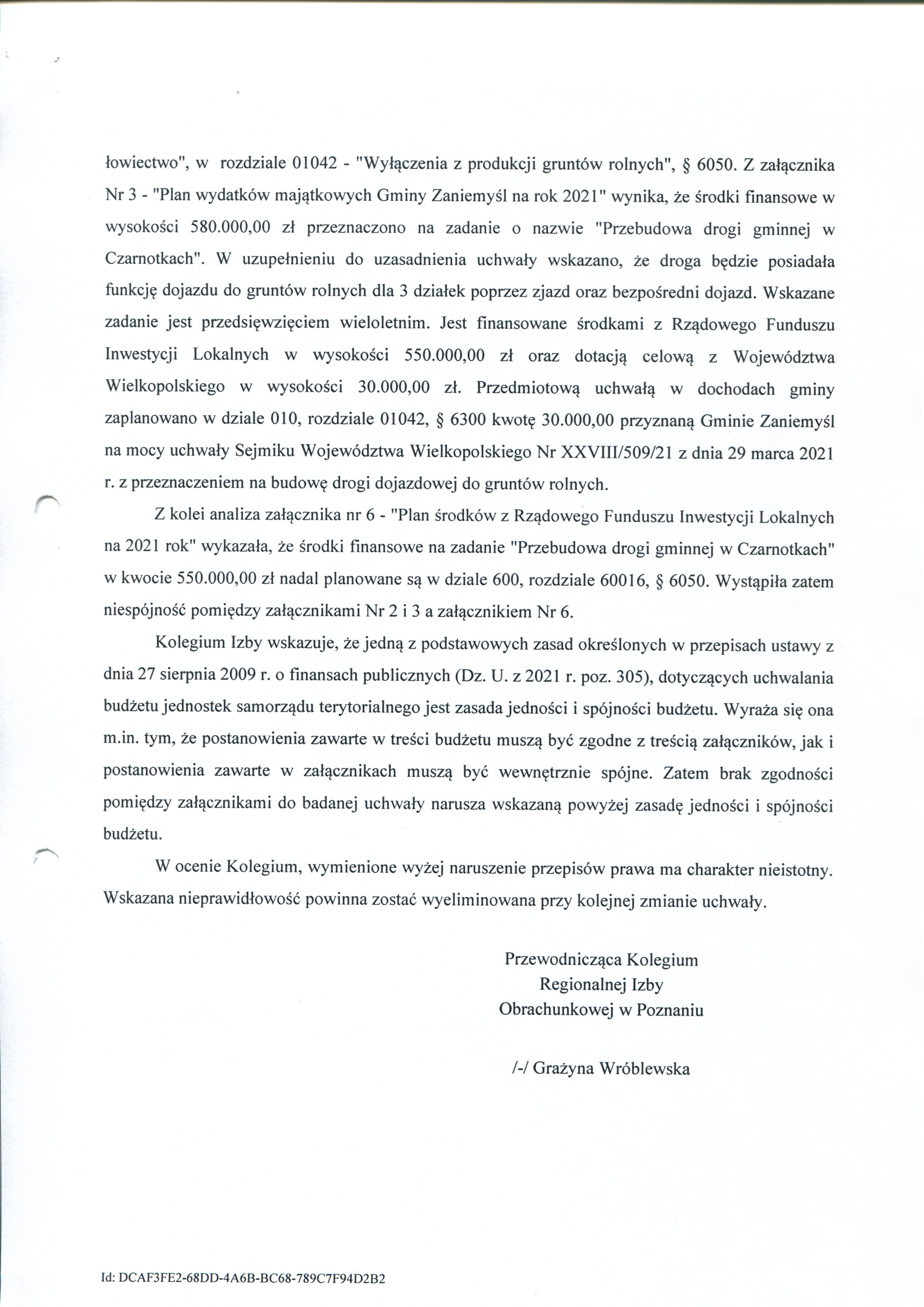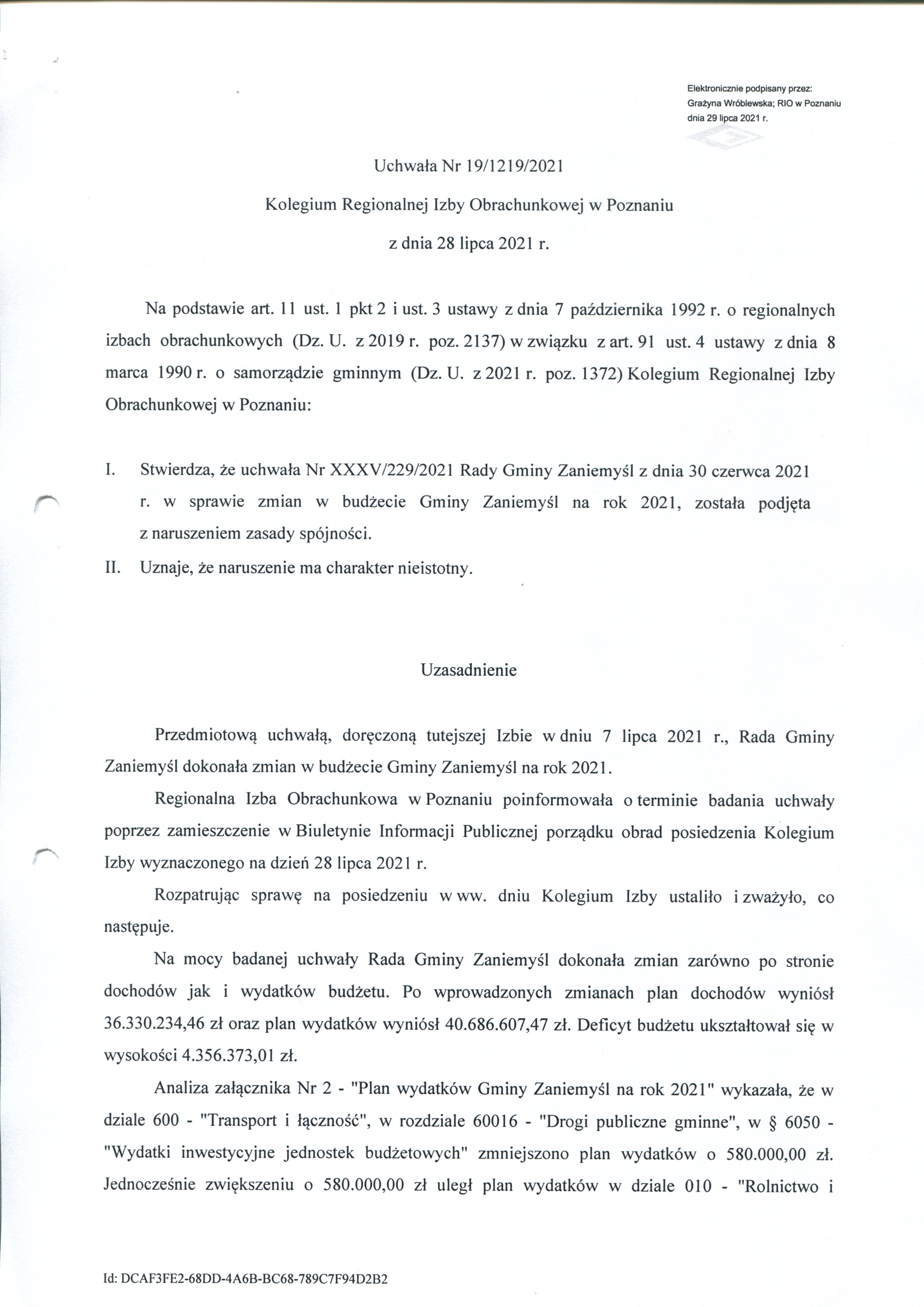 Kolegium Regionalnej Izby Obrachunkowej w Poznaniu - uchwała Nr 96/1219/2021 dotycząca Uchwały Nr XXXV/229/2021 Rady Gminy Zaniemyśl z dnia 30 czerwca 2021 r.
