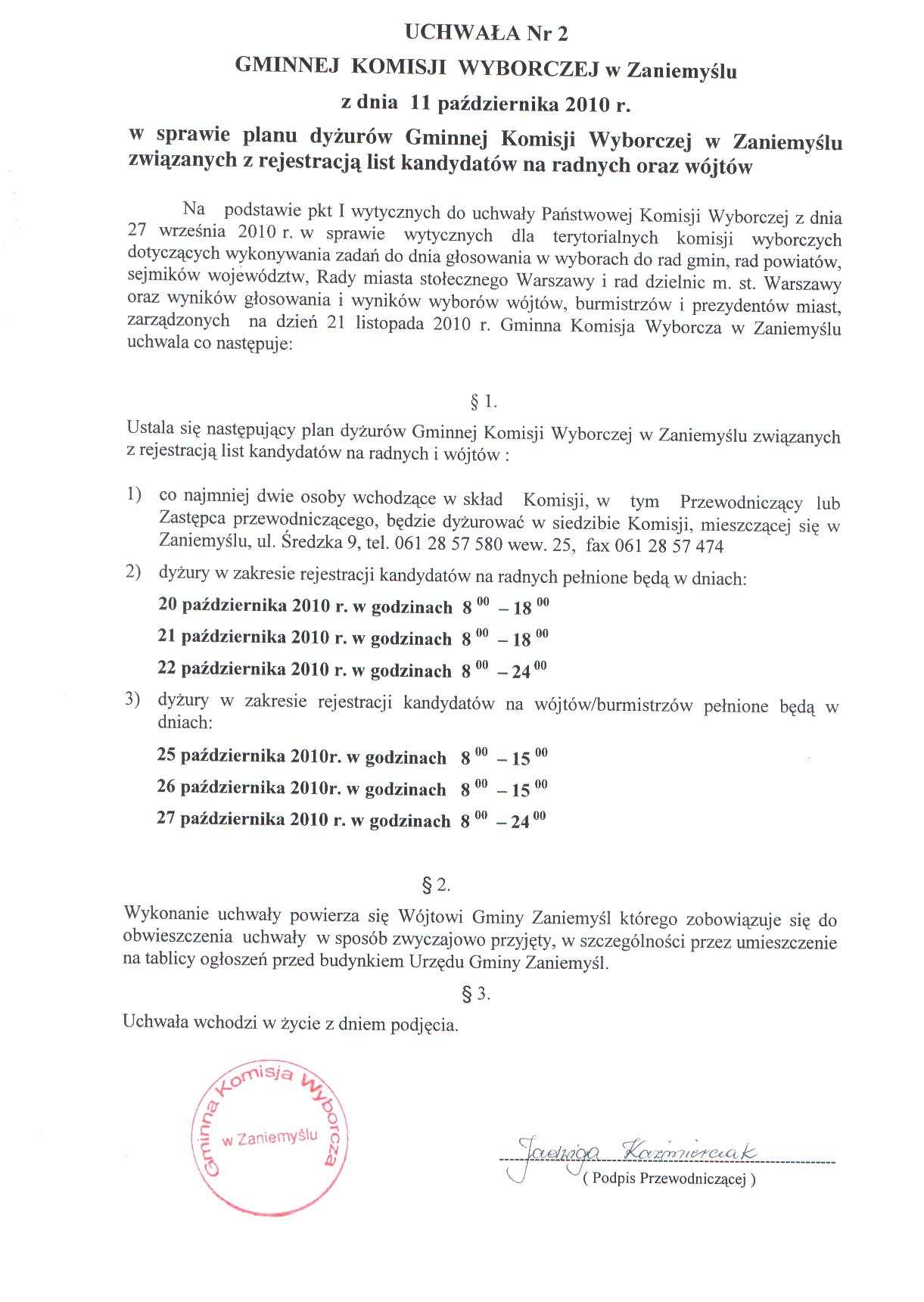 Uchwała z dnia 11 października 2010r. w sprawie planu dyżurów Gminnej Komisji Wyborczej w zaniemyślu związanych z rejestracją list kandydatów na radnych oraz wójtów - więcej