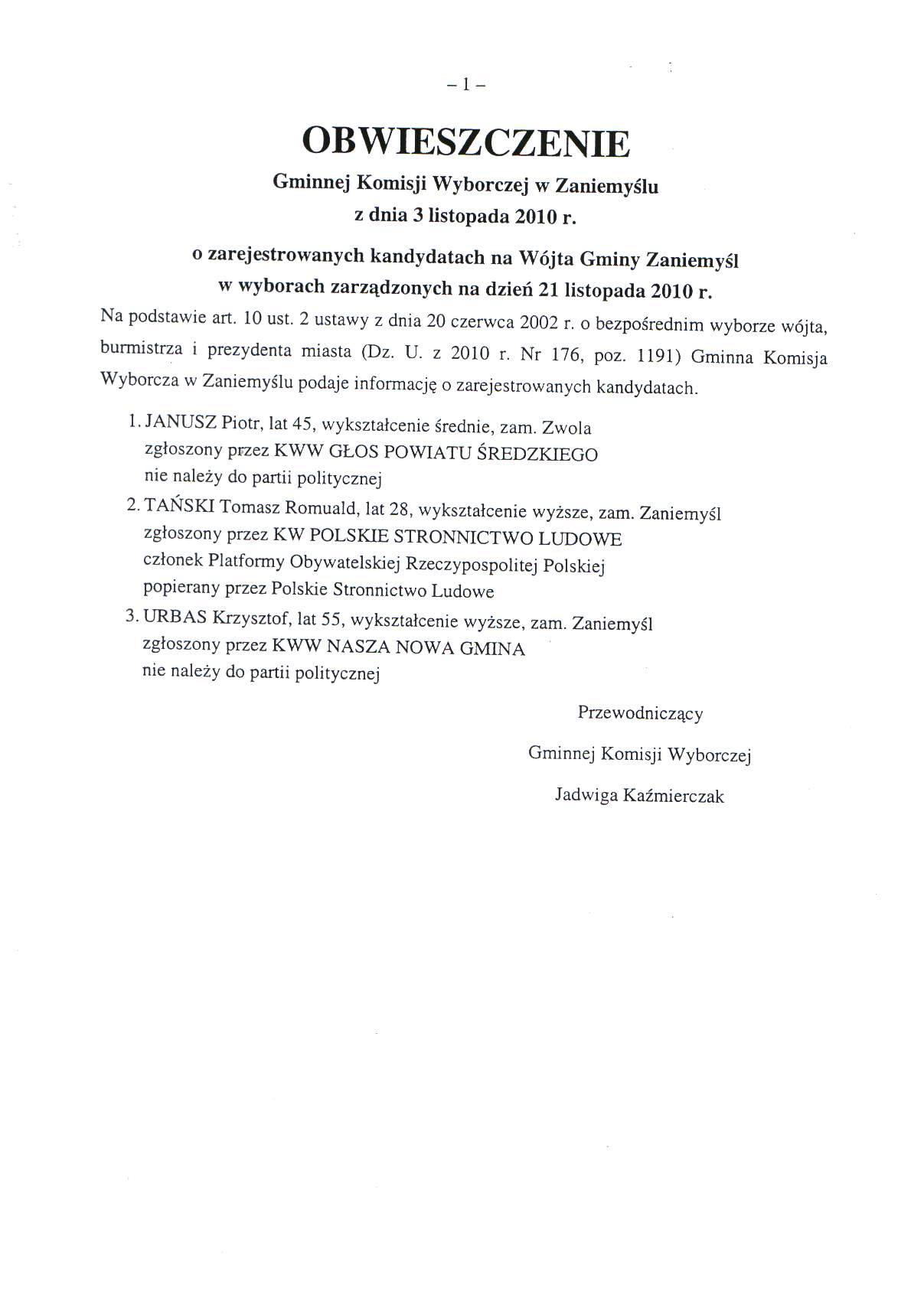 Obwieszczenie Gminnej Komisji Wyborczej w Zaniemyślu z dnia 3 listopada 2010r. o zarejestrowanych kandydatach na Wójta Gminy Zaniemyśl w wyborach zarządzonych na dzień 21 listopada 2010r. - więcej